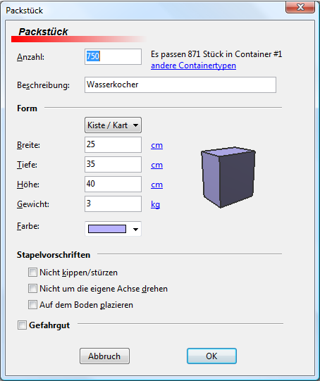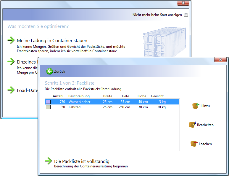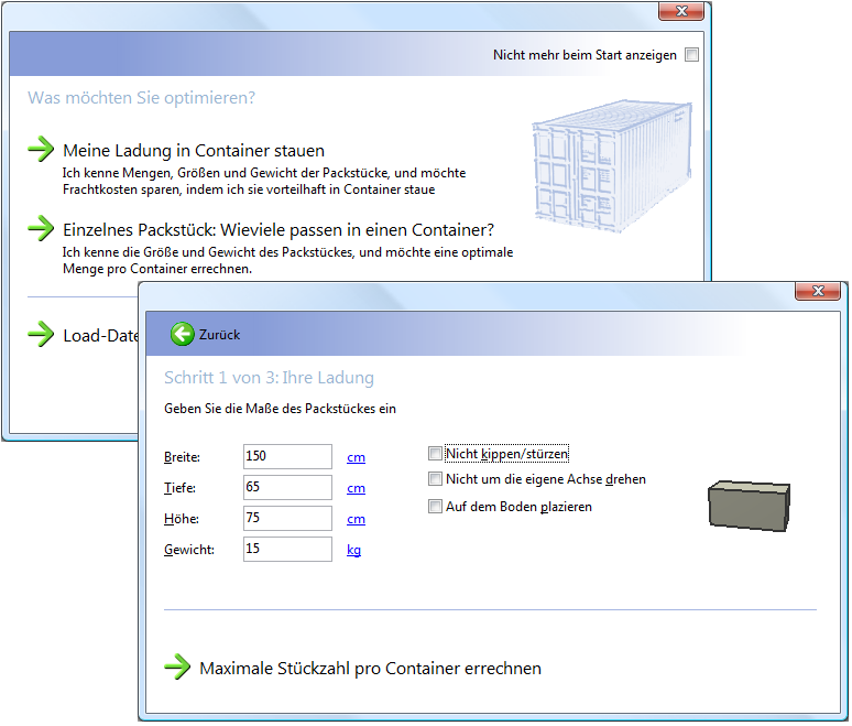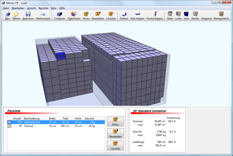 Load! errechnet Ihnen eine maximale Anzahl von Packstücken pro Container.
